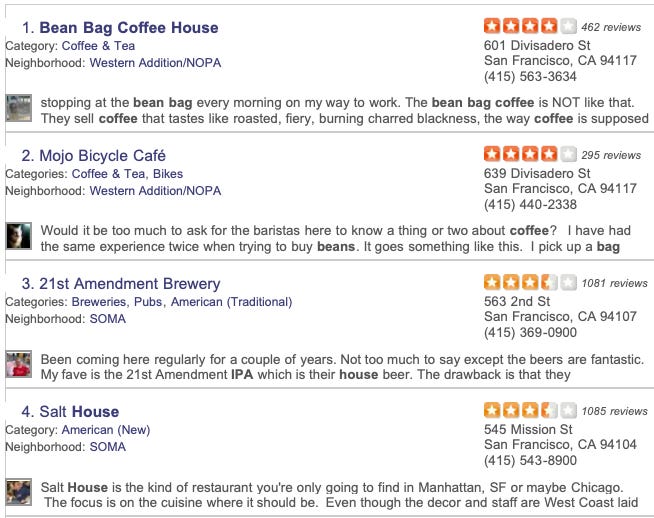 Bean Bag Coffee House tenía 4 estrellitas, Mojo Bicycle Café también. 21st Amendment Brewery tenía 3.5, igual que Salt House. 1081 reviews tiene 21st Amendment y JUSTO le da 3.5 estrellas. Bean Bag tiene casi 500 y también, JUSTO 4 estrellas, no 4.1, ni 4.2, exactamente 4. ¿Casualidad? Not really. La cosa es que Yelp, quién sabe por qué, redondeaba en 0.5’s. O sea: si sos un 4.24 según Yelp sos un 4 y si sos 4.25 según Yelp sos un 4.5. Imagino que ya te diste cuenta a qué voy con esto.