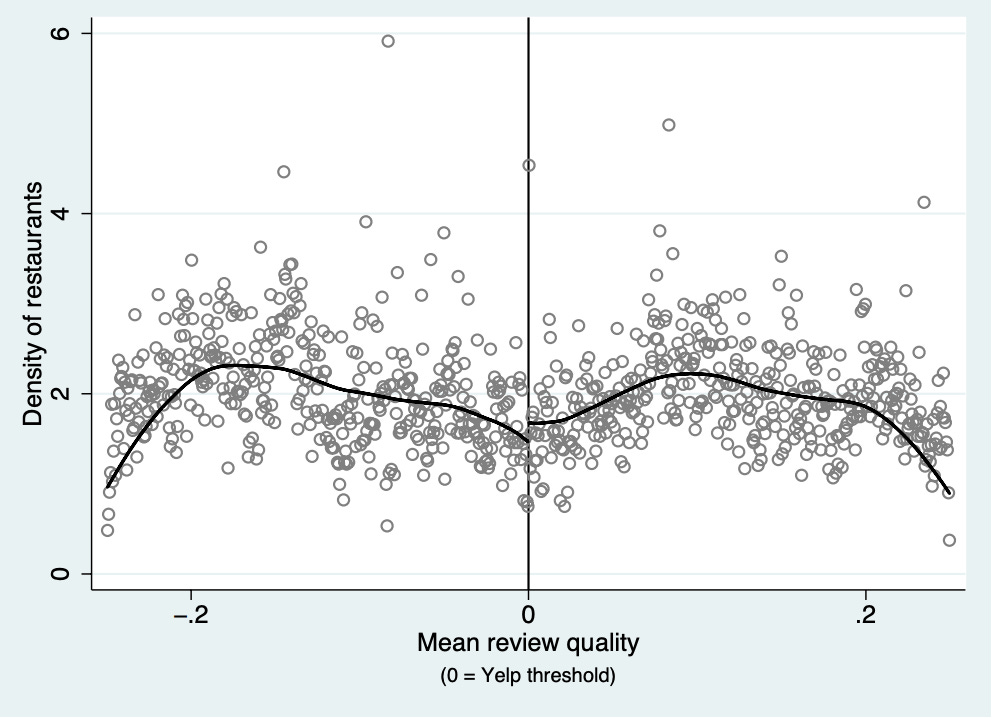 Si te digo que los ratings sirven porque los restaurantes que tienen 4.5 estrellas tienen más demanda que los que tienen 4 vos me vas a decir con razón que soy medio boludo, que obvio que tienen más demanda. No porque su rating sea mayor (y por eso generan más interés) sino porque es un restaurant mejor y la gente suele demandar más restaurantes mejores que restaurantes peores. Ahí esta el catch: es cierto que uno de 4.5 estrellas es mejor que uno de 4, pero, ¿uno de 4.25 es realmente TANTO mejor que uno de 4.24? Como Yelp redondea en 0.5’s, puedo tranquilamente enfocarme en la discontinuidad y comparar cómo le va a un restaurant que tuvo la mala suerte de quedar una décima abajo del umbral (y entonces en la app aparece que es 4 estrellas) con otro que tuvo la buena suerte de quedar una décima arriba (y entonces en la app aparece que es 4.5 estrellas). El método ya lo explicamos varias veces y se llama regresión discontinua (mirá acá para más detalle, o no seas rata y comprame el libro que ahí se explica aún mejor).